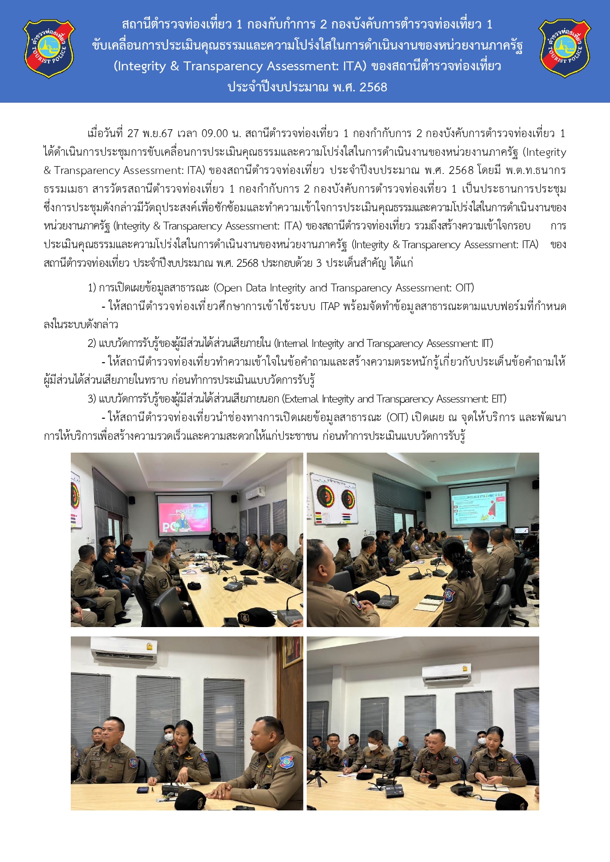 ขับเคลื่อนการประเมินคุณธรรมและความโปร่งใสในการดำเนินงานของหน่วยงานภาครัฐ (ITA) ของสถานีตำรวจท่องเที่ยว