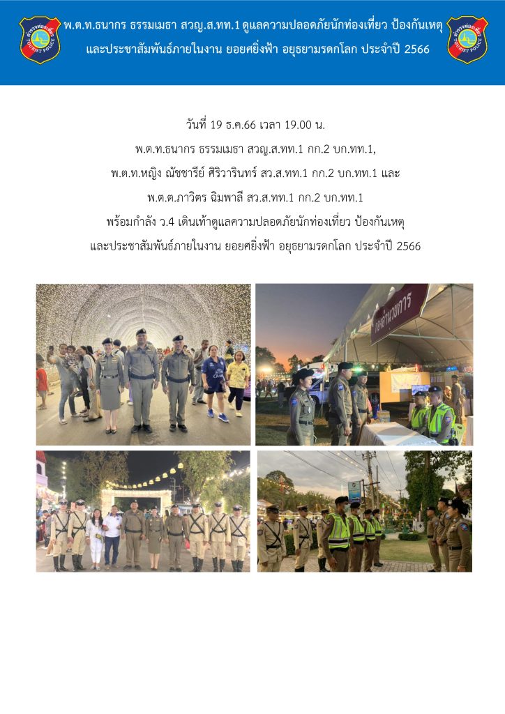 วันที่ 19 ธ.ค.66 เวลา 19.00 น. เดินเท้าดูแลความปลอดภัยนักท่องเที่ยว ป้องกันเหตุและประชาสัมพันธ์