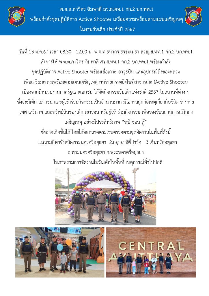 วันที่ 13 ม.ค.67 เวลา 08.30 – 12.00 น.เตรียมความพร้อมตามแผนเผชิญเหตุ คนร้ายกราดยิงในที่สาธารณะ (Active Shooter)