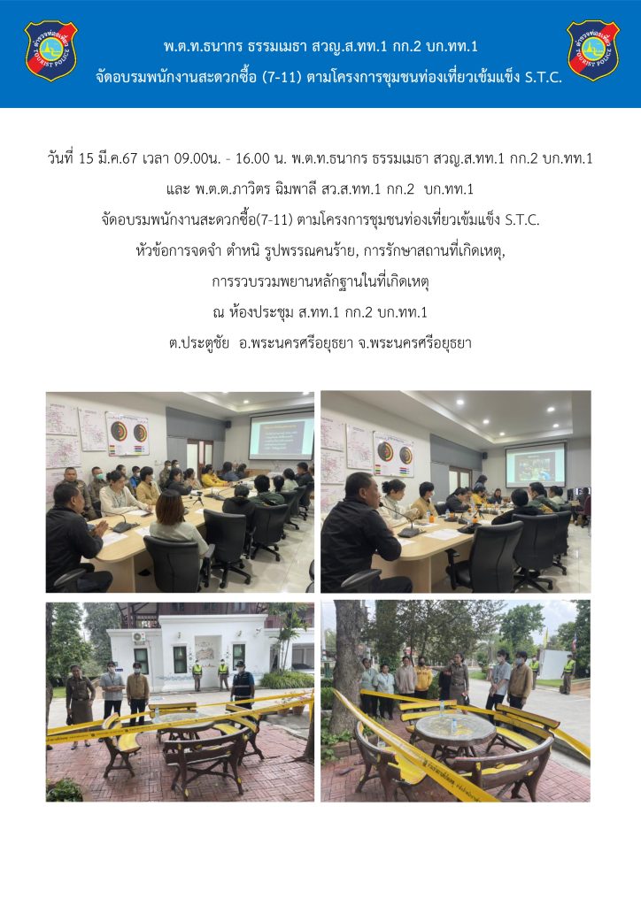 วันที่ 15 มี.ค.67 เวลา 09.00 น. – 16.00 น. จัดอบรมพนักงานสะดวกซื้อ(7-11) ตามโครงการชุมชนท่องเที่ยวเข้มแข็ง S.T.C.