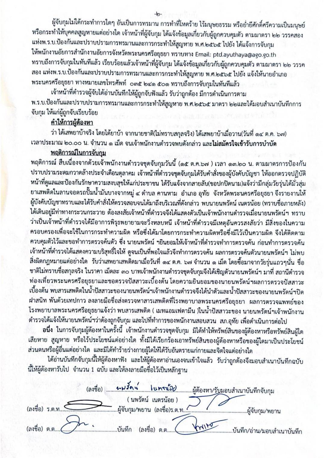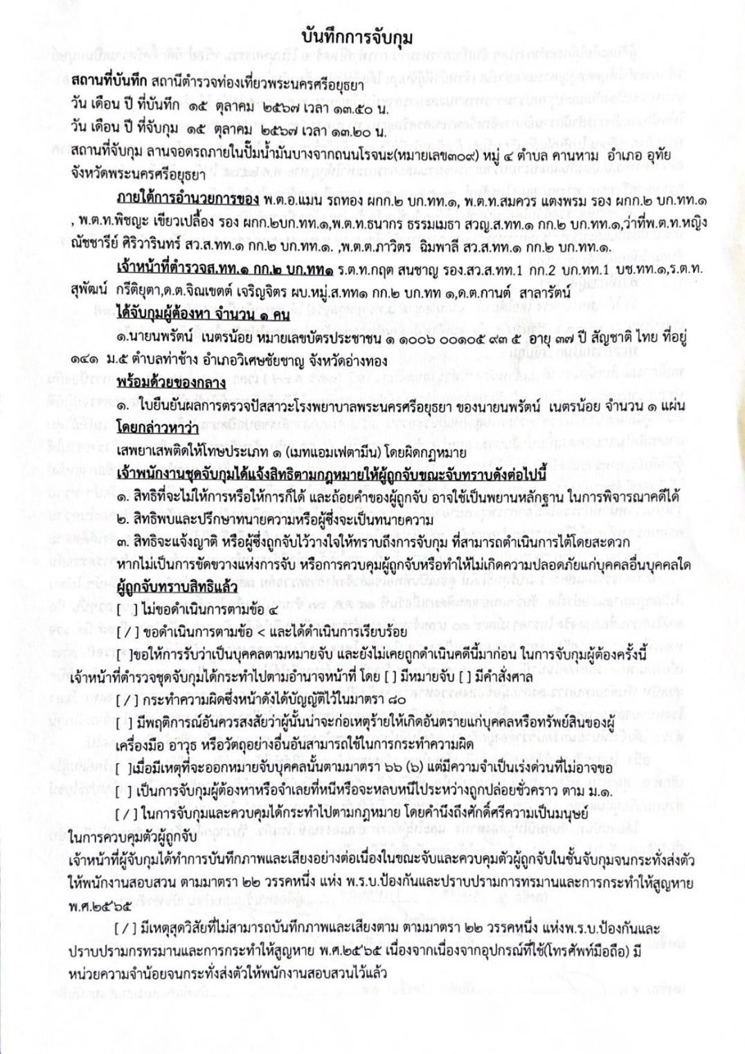 สถานที่จับกุม:บริเวณลานจอดรถภายในปั๊มน้ำมันบางจากถนนโรจนะหมายเลข ๓๐๙ หมู่ ๔ ตำบลคานหาม อ.อุทัย จ.พระนครศรีอยุธยา