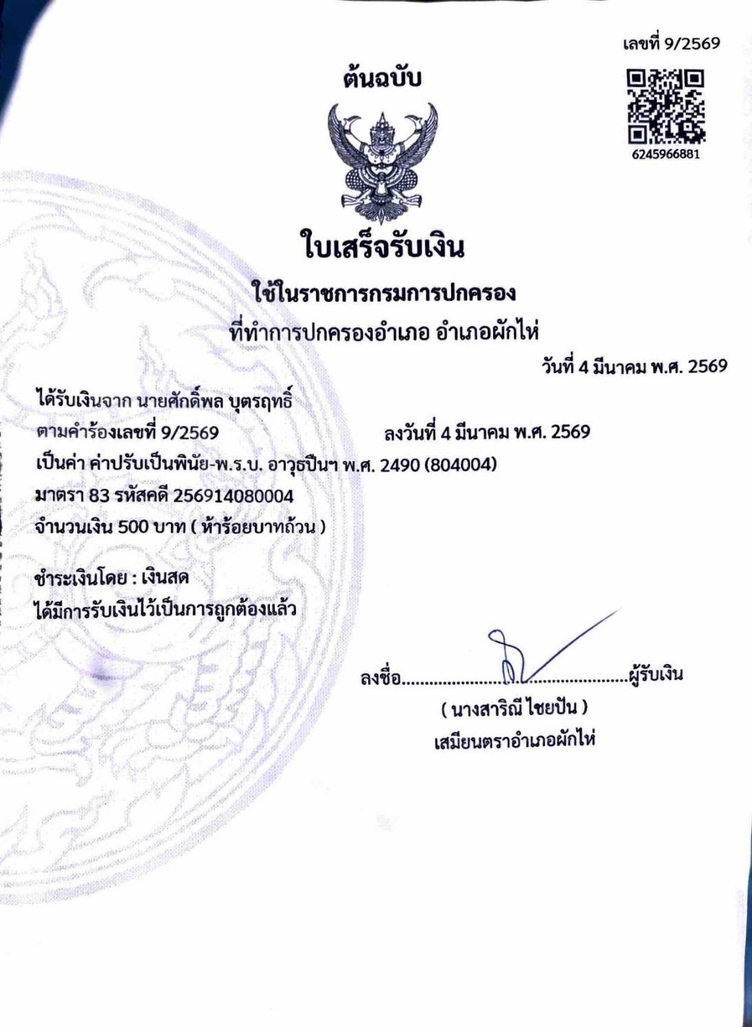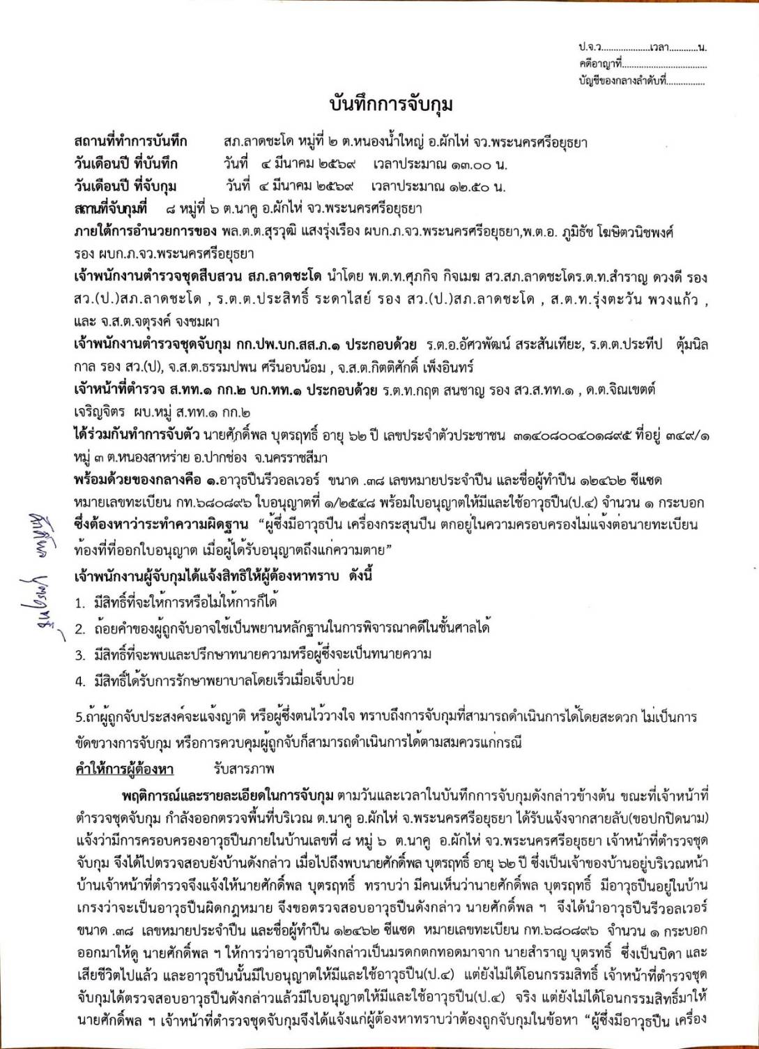 ได้ร่วมกันทำการจับตัว นายศักดิ์พล อายุ 62 ปี ที่อยู่หมู่ที่ 3 ตำบลหนองสาหร่าย อำเภอปากช่อง จังหวัดนครราชสีมา พร้อมด้วยของกลางคือ 1. อาวุธรีวอลเวอร์ ขนาด .38 หมายเลขประจำปี และชื่อผู้ทำปืน 12462 ซีแซด หมายเลขทะเบียน กท. 680896 ใบอนุญาตที่ 1/2548 พร้อมใบอนุญาตให้มีและใช้อาวุธปืน(ป.4) จำนวน1 กระบอก