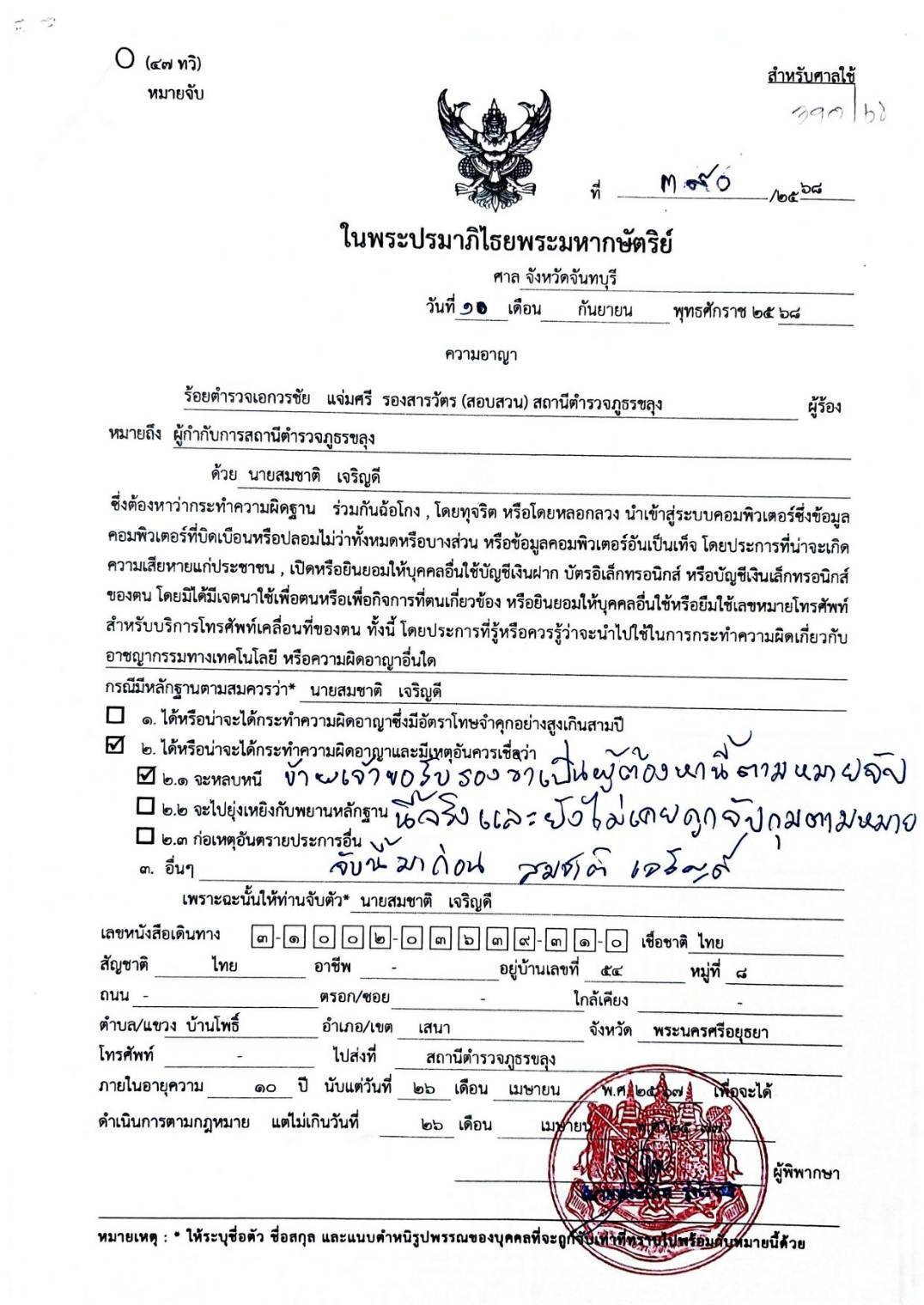 1.) นายสมชาติ อายุ 51 ปี บ้านเลขที่ 54 ม.8 ต.บ้านโพธิ์อ.เสนา จ.พระนครศรีอยุธยา ผู้ต้องหาตามหมายจับ ศาลอาญากรุงเทพใต้ที่ 0164/2569 ลงวันที่ 16 กุมภาพันธ์ 2569 โดยแจ้งข้อหา”ร่วมกันฉ้อโกงประชาชน ร่วมกันโดยทุจริตหรือโดยหลอกลวงร่วมกันนำเข้าสู่ระบบคอมพิวเตอร์ซึ่งข้อมูลคอมพิวเตอร์ที่บิดเบือนหรือปลอมไม่ว่าทั้งหมดหรือบางส่วนหรือข้อมูลคอมพิวเตอร์อันเป็นเท็จโดยประการที่น่าจะเกิดความเสียหายแก่ประชาชน” เเละจากการตรวจสอบ