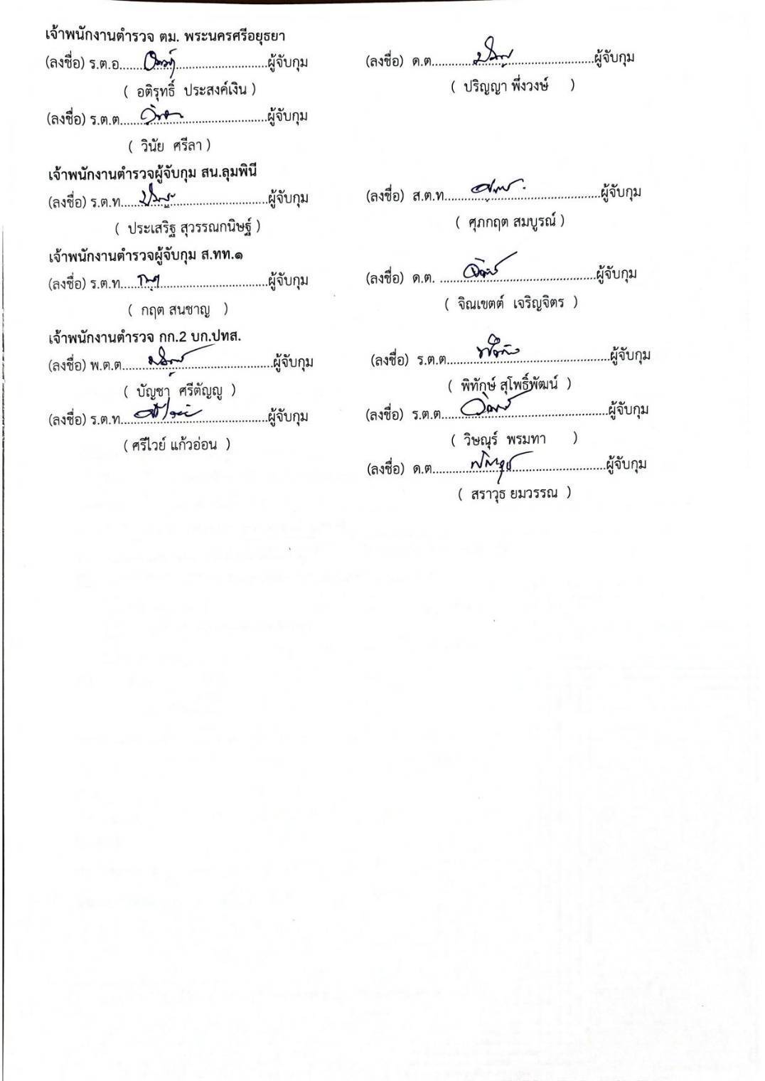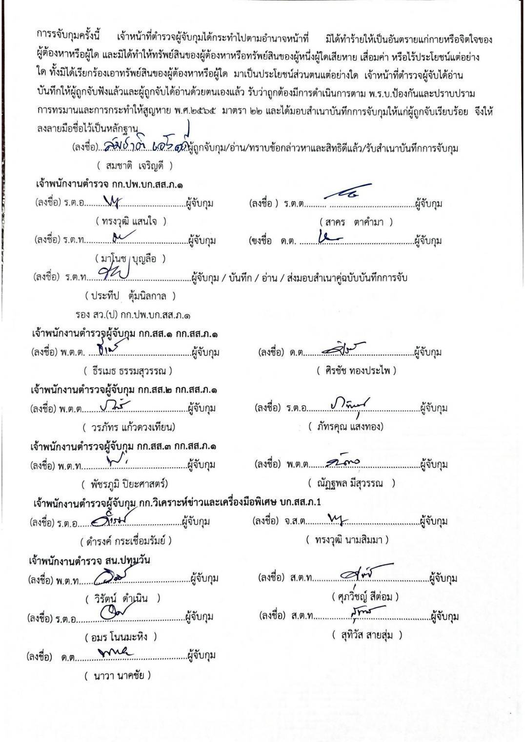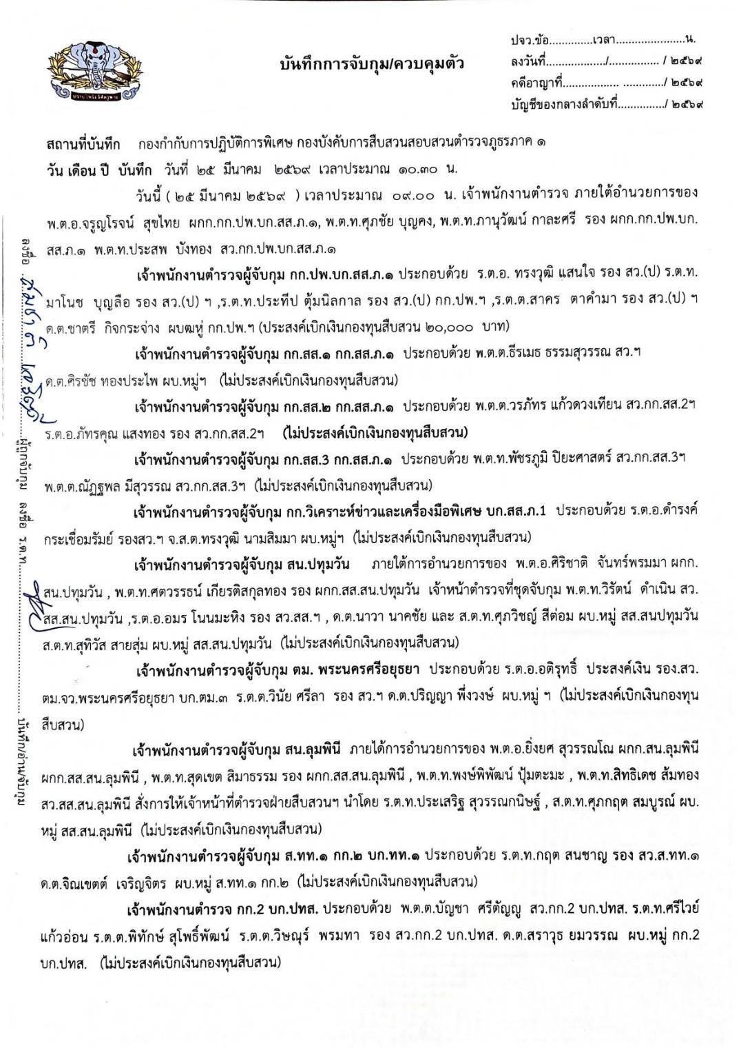 พ.ต.อ.มิลิน เพียรช่าง ผกก.2 บก.ทท.1, พ.ต.ท.ศุภรัตน์ มีปรีชา รอง ผกก.2 บก.ทท.1, พ.ต.ท.พิชญะ เขียวเปลื้อง รอง ผกก.2 บก.ทท.1, พ.ต.ท.ศุภรภัจ ศิลปศร สวญ.ส.ทท.1 กก.2 บก.ทท.1, พ.ต.ท.หญิงณัชชารีย์ ศิริวารินทร์ สว.ส.ทท.1 กก.2 บก.ทท.1 และ พ.ต.ท.พงษ์ศักดิ์ แสงมหาชัย สว.ส.ทท.1 กก.2 บก.ทท.1 สั่งการให้เจ้าหน้าที่ตำรวจ ส.ทท.1 กก.2 บก.ทท.1 ร่วมกับเจ้าหน้าที่ตำรวจ กก.ปพ.บก.สส.ภ.1 ร่วมกันจับกุม : จำนวน 1 ราย 1 คน ดังนี้