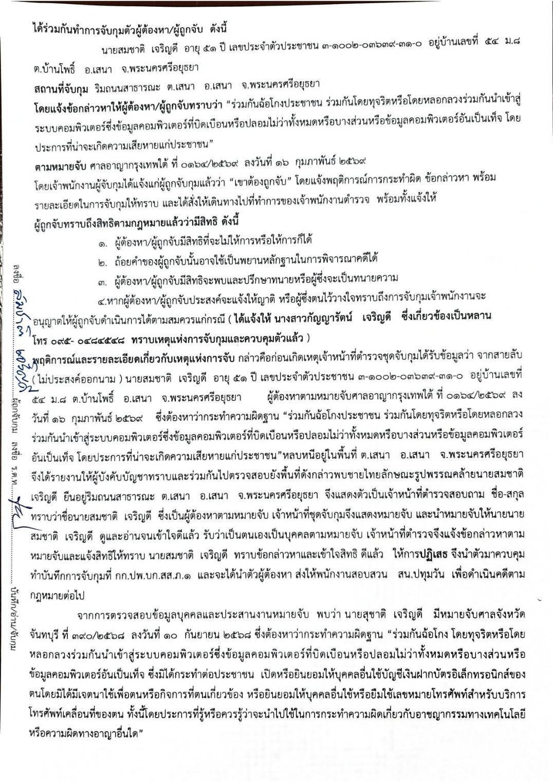 1.) นายสมชาติ อายุ 51 ปี บ้านเลขที่ 54 ม.8 ต.บ้านโพธิ์อ.เสนา จ.พระนครศรีอยุธยา ผู้ต้องหาตามหมายจับ ศาลอาญากรุงเทพใต้ที่ 0164/2569 ลงวันที่ 16 กุมภาพันธ์ 2569 โดยแจ้งข้อหา”ร่วมกันฉ้อโกงประชาชน ร่วมกันโดยทุจริตหรือโดยหลอกลวงร่วมกันนำเข้าสู่ระบบคอมพิวเตอร์ซึ่งข้อมูลคอมพิวเตอร์ที่บิดเบือนหรือปลอมไม่ว่าทั้งหมดหรือบางส่วนหรือข้อมูลคอมพิวเตอร์อันเป็นเท็จโดยประการที่น่าจะเกิดความเสียหายแก่ประชาชน” เเละจากการตรวจสอบ