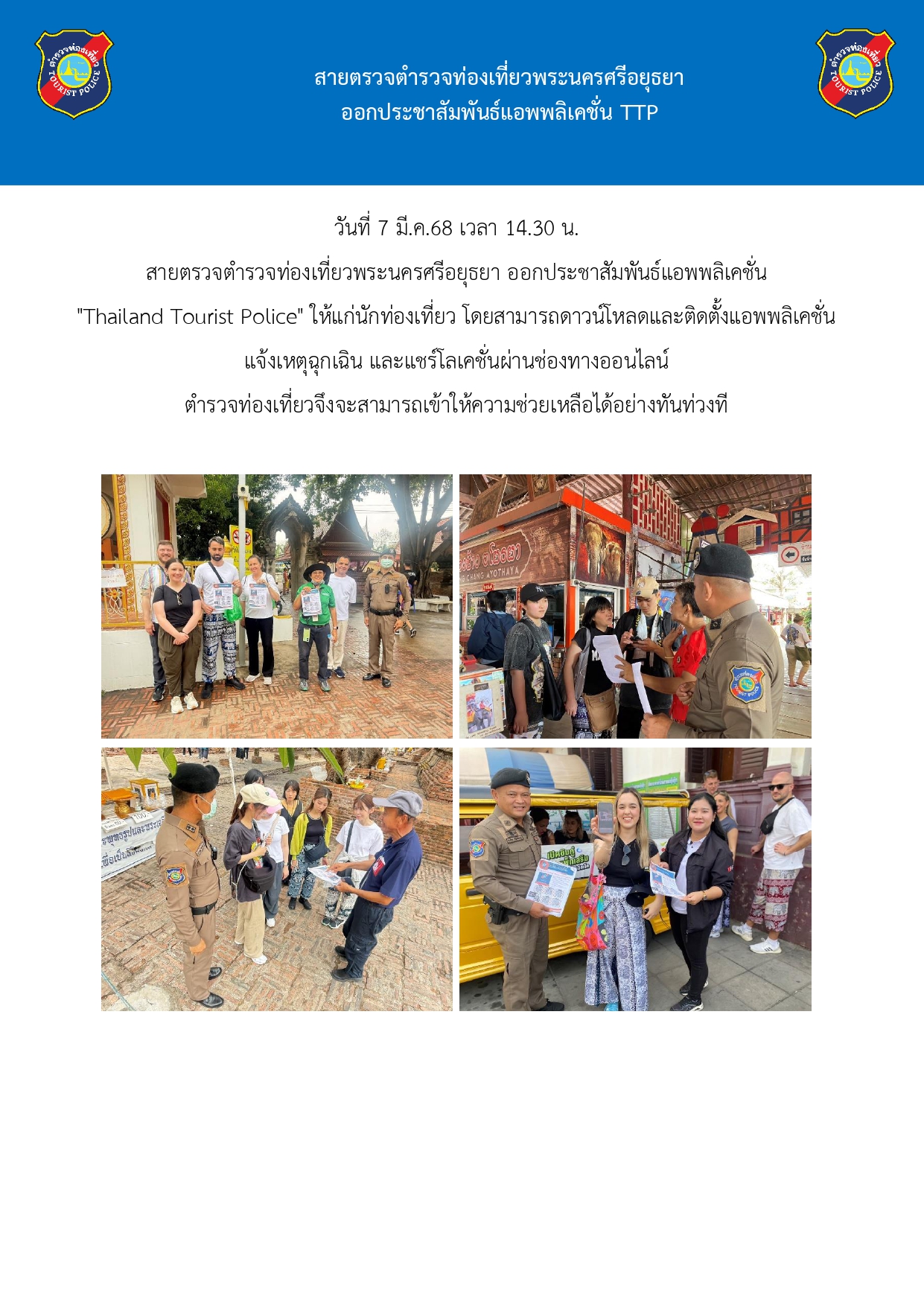 สายตรวจตำรวจท่องเที่ยวพระนครศรีอยุธยา ออกประชาสัมพันธ์แอพพลิเคชั่น TTP