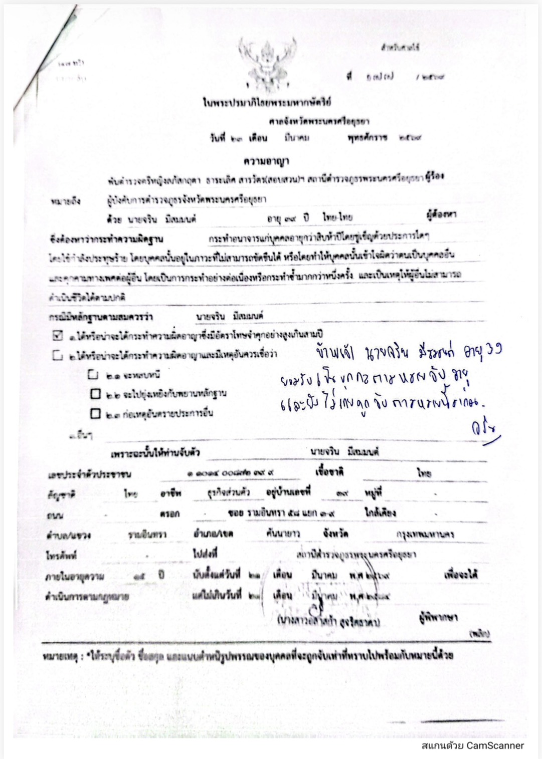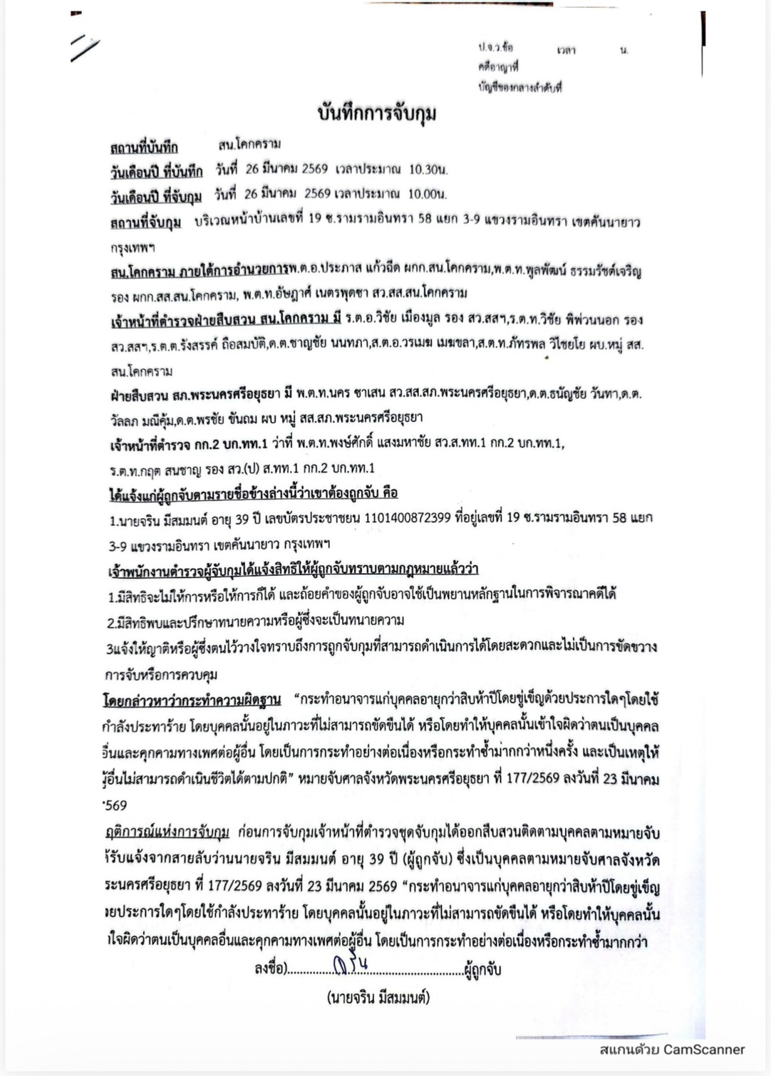 1. นายจริน อายุ 39 ปี ที่อยู่เลขที่ 19 ซอยรามรามอินทรา 58 แยก 3-9 แขวงรามอินทรา เขตคันนายาว กรุงเทพมหานคร “โดยกล่าวหาว่ากระทำความผิดฐานกระทำอนาจารแก่บุคคลอายุกว่า 15 ปีโดยขู่เข็ญด้วยประการใดใดโดยใช้กำลังประทาร้ายโดยบุคคลนั้นอยู่ในภาวะที่ไม่สามารถขัดขืนได้หรือโดยทำให้บุคคลนั้นเข้าใจผิดว่าตนเป็นบุคคลอื่นและคุกคามทางเพศต่อผู้อื่นโดยเป็นการกระทำอย่างต่อเนื่องหรือกระทำซ้ำมากกว่าหนึ่งครั้งและเป็นเหตุให้ผู้อื่นไม่สามารถดำเนินชีวิตได้ตามปกติ หมายจับศาลจังหวัดพระนครศรีอยุธยา ที่ 177/2569 ลงวันที่ 23 มีนาคม 2569 สถานที่จับกุม : บริเวณหน้าบ้านเลขที่ 19 ซอยรามรามอินทรา 58 แยก 3-9 แขวงรามอินทรา เขตคันนายาว กรุงเทพมหานคร โดยนำตัวส่ง : ส่ง พงส. สภ.พระนครศรีอยุธยา เพื่อดำเนินการตามกฏหมายต่อไป