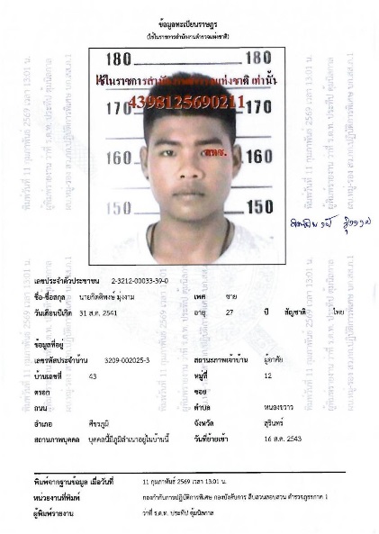 วันที่ (11 กุมภาพันธ์ 2569) เวลาประมาน 13.40 น. นายกิตติพงษ์ อายุ 27 ปี 43/ม.12 ต.หนองขาว อ.ศรีขรภู
