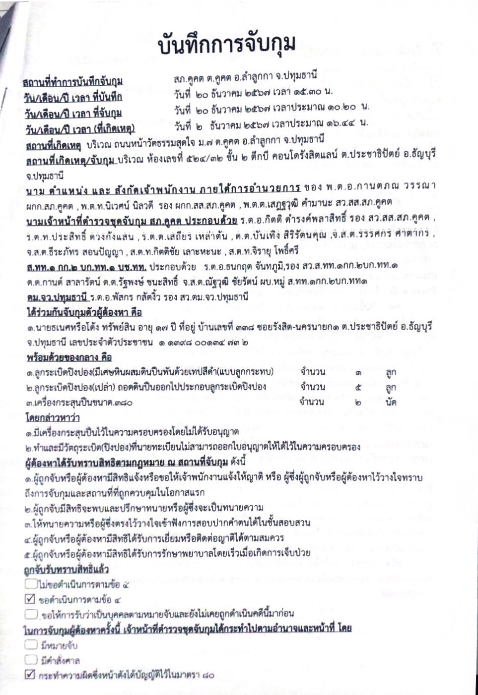 สถานที่จับกุม :บริเวณ ห้องเลขที่ 524/32 ชั้น 2 ตึกบี คอนโดรังสิตแลน์ ต.ประชาธิปัตย์ อ.ธัญบุรี จ.ปทุมธานี