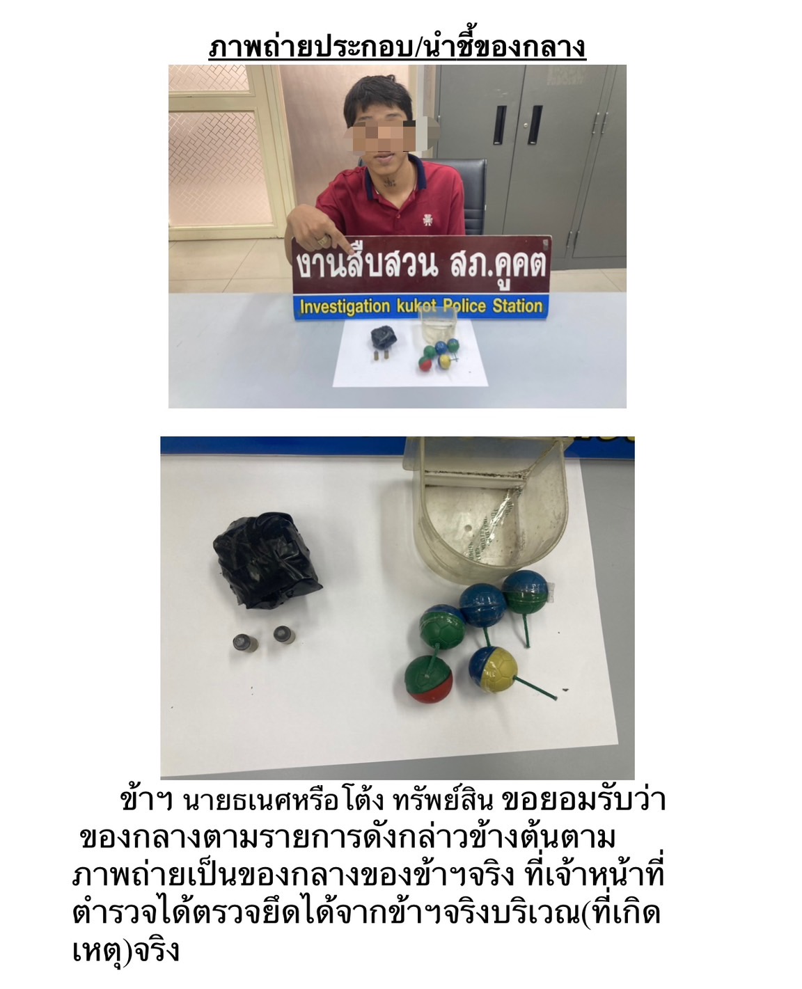 1.ลูกระเบิดปิงปอง(มีเศษหินผสมดินปืนพันด้วยเทปสีดำ(แบบลูกกระทบ) จำนวน 1 ลูก